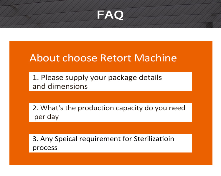For high temperature sterilization of fruits, vegetables, meat, fish, convenience foods, etc. Container: glass jar, glass can, tin, cans, PP bottles, HDPE bottles,plastic containers Soft bag packaging: aluminum foil bag, transparent bag, vacuum bag, cooking bag Main Features: