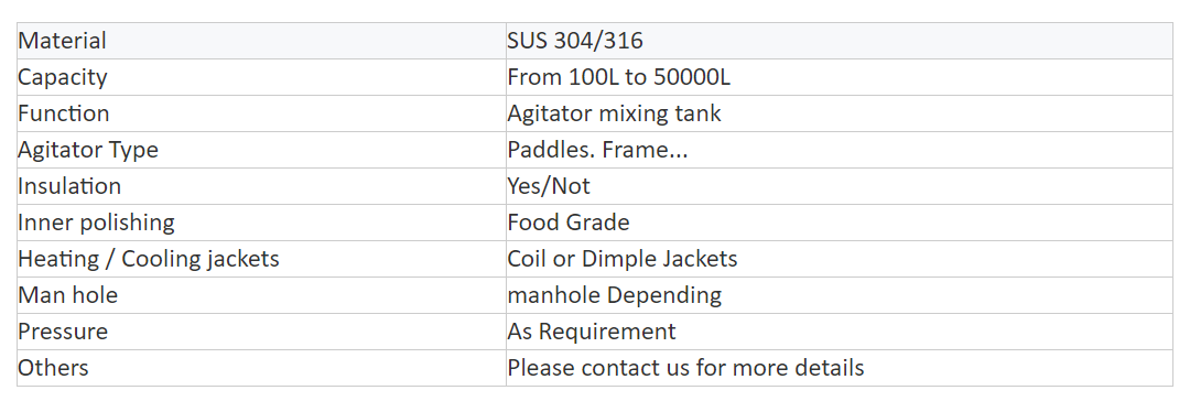 Single layer, Double layer and three-layer stainless steel tanks with or without agitator to blend product, with a wide capacity range from 100L to 20,000L , and the tank can be customized according to user requirements.