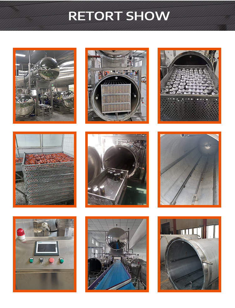 For high temperature sterilization of fruits, vegetables, meat, fish, convenience foods, etc. Container: glass jar, glass can, tin, cans, PP bottles, HDPE bottles,plastic containers Soft bag packaging: aluminum foil bag, transparent bag, vacuum bag, cooking bag Main Features: